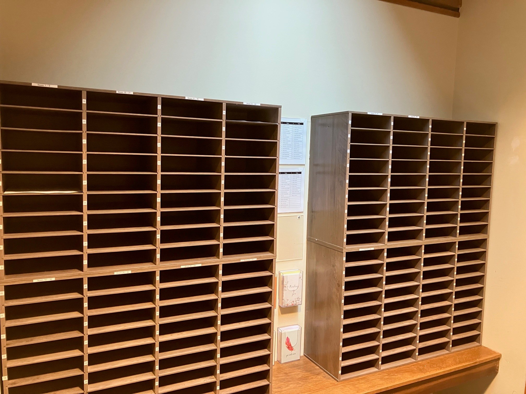 We encourage everyone to check the mailboxes on a regular basis. We will be putting items on a quarterly basis with different announcements, news, and info in the church mailboxes. If we notice that mail is starting to pile up in your mailbox, we may give you a call to check in. If you feel that you will no longer utilize the mailbox ministry at the church and would like to give up your mailbox number, just let us know.